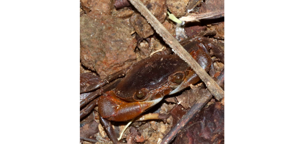 The freshwater crab is an omnivore that feeds on a variety of organic matter, including decomposing leaves, fallen fruits, small aquatic invertebrates, and occasionally carrion. As a detritivore, it plays a crucial role in nutrient recycling and maintaining water quality. This crab is primarily nocturnal, which allows it to avoid predators and high temperatures. Males can be territorial, especially during the breeding season, which usually occurs during the rainy season. Females carry the eggs under their abdomen until hatching, releasing fully formed young crabs into the aquatic environment. Although freshwater crabs, they can survive out of water for short periods thanks to adapted gills that retain moisture. Like all crustaceans, Guinotia dentata molts regularly to grow, a process during which it is particularly vulnerable to predators.