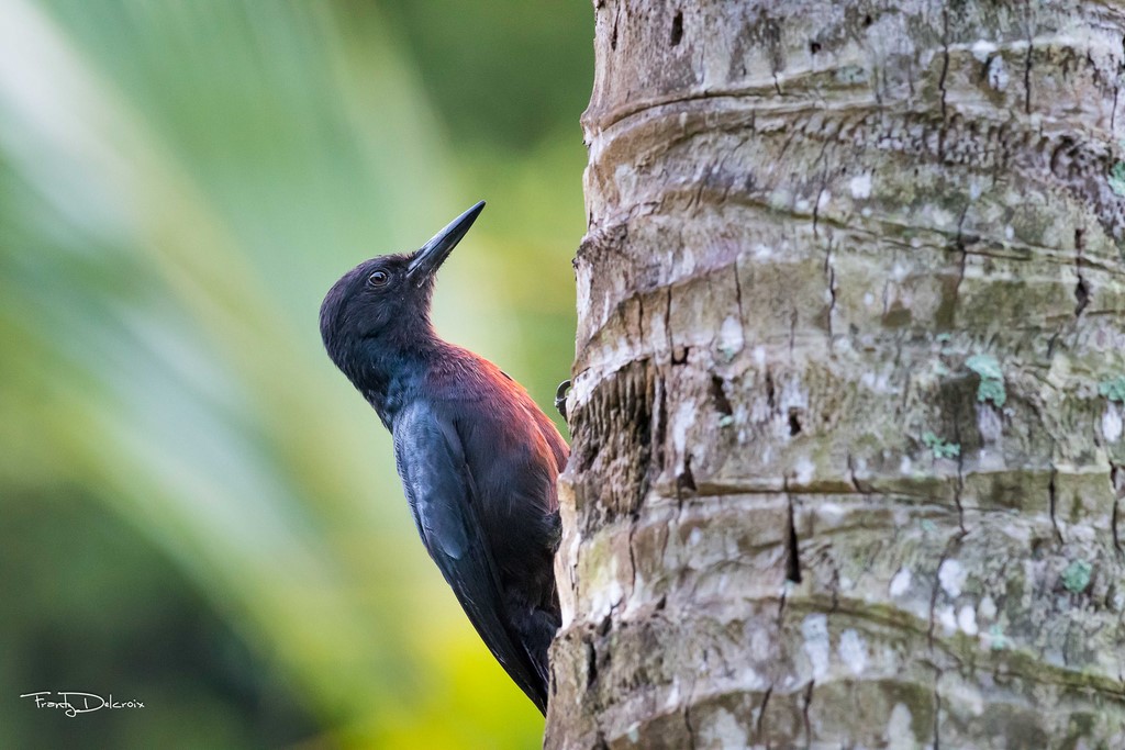 The Guadeloupe woodpecker, an endemic and protected species in Guadeloupe, is the only resident woodpecker in the Lesser Antilles. It is recognized by its red throat and belly, which contrast with its black plumage. Its wings are metallic blue, and its legs are gray-green. The male’s beak is longer than its head, unlike the female. It measures 26–28 cm and feeds on termites, ants, larvae, and small fruits.