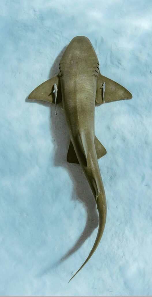 The Lemon Shark (Negaprion brevirostris), which can reach up to 3.5 meters in length, gets its name from its coloration, which ranges from yellow to green depending on the light in the water. This feature helps it blend into sandy bottoms while hunting. Its distinctive characteristics—piercing, cat-like eyes and two equally sized dorsal fins—make it easily recognizable. Contrary to common beliefs about sharks, this species is not considered a threat to humans. Social and curious by nature, Lemon Sharks often rest on the sea floor to observe divers and may even allow gentle contact.